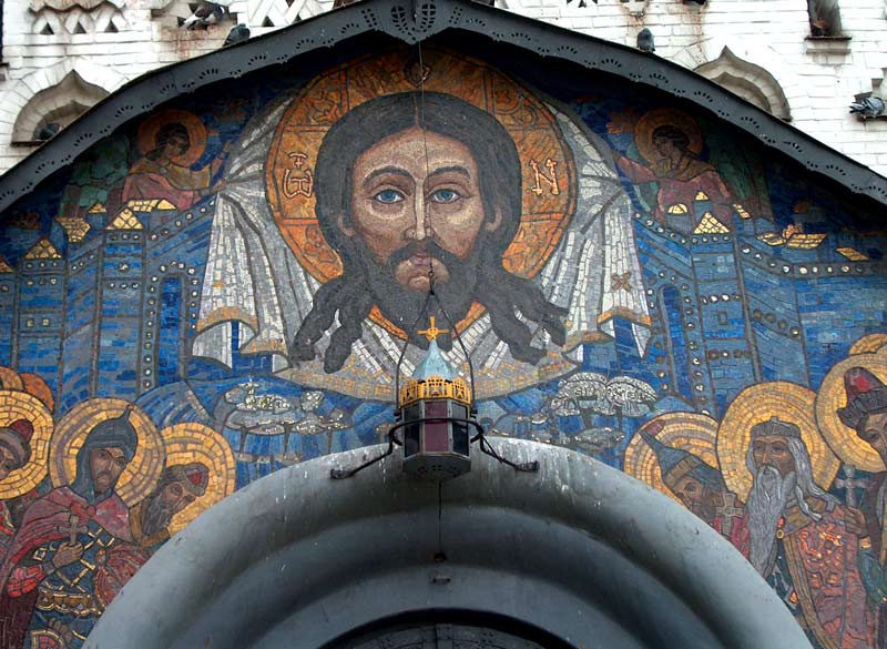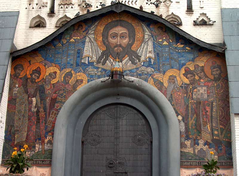 Почаевская лавра. Мозаика южного портала Троицкого собора "Спас и князья святые" выполнена в 1910 по эскизам Н.К.Рериха мастерской В.А.Фролова (фото 2003 г.)