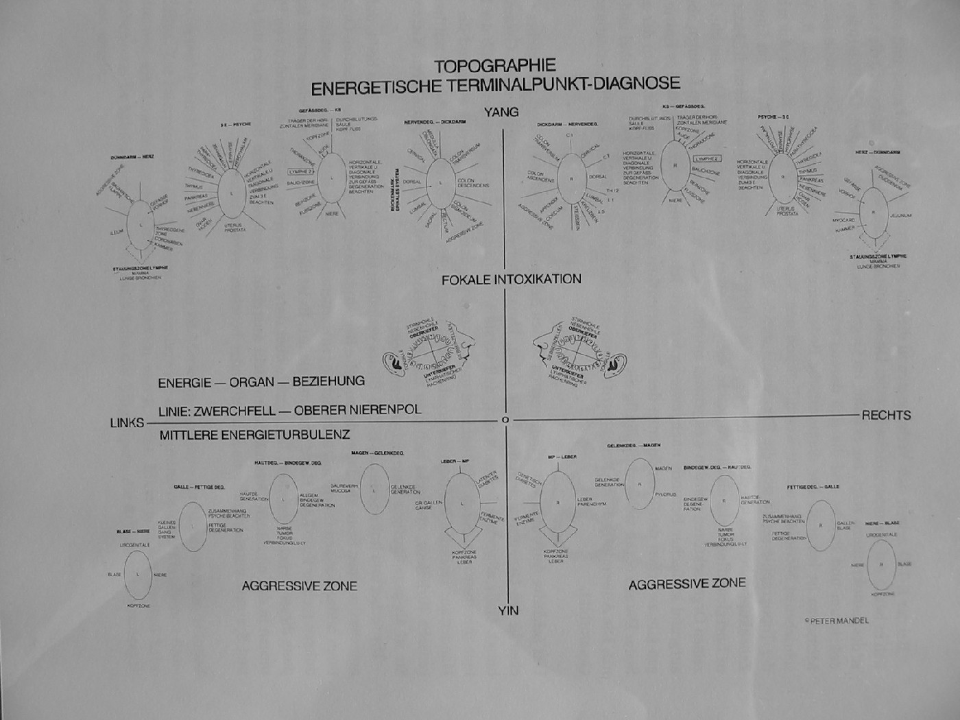 Теперь давайте посмотрим на настоящую немецкую таблицу Манделя, которую я перевёл из его книги "Energetische Terminalpunkt-Diagnose", которая является настольной библией всех тех, кто работает по методу Манделя. Прилагаю сканкопию сводной таблицы анатомической топографии энергетического акупунктурного диагноза Манделя из этой книги. (Сканкопия большая, поэтому не показывается картинкой в окошке вложений – грузите на свой комп и смотрите сами).