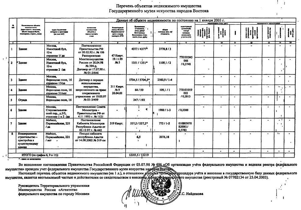 Перечень объектов недвижимого имущества ГМВ (см. пункт 6, где указана усадьба Лопухиных под старым адресом: пер. Староваганьковский 3/5).