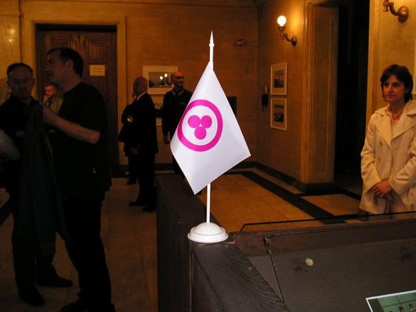 Знамя Мира на открытии выставки картин Н.К.Рериха в Болгарии (София, Галерия за Чуждестранни Изкуство (НАГЧУ), 30.05.05).